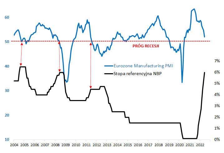 Sygnałem, na który czeka rynek obligacji, by dokonać definitywnej zmiany trendu, byłby koniec cyklu podwyżek stóp procentowych. W poprzednich miesiącach, szczególnie po wybuchu wojny w Ukrainie, oczekiwania rynkowe odnośnie poziomu docelowego i terminu końca cyklu notorycznie przesuwały się w górę, co tylko dolewało oliwy do ognia. O ile na razie zatrzymanie podwyżek w bliskiej przyszłości ciągle nie jest przesądzone, to jednak niewątpliwie jesteśmy już relatywnie blisko takiego punktu. Taki wniosek wynika z opisywanej już wcześniej, dostrzeżonej przez nas zależności, zgodnie z którą w poprzednich trzech cyklach Rada Polityki Pieniężnej kończyła podwyżki wtedy, gdy jasne stawało się, że europejska gospodarka wkracza na granicę recesji – sygnałem takim był spadek wskaźnika koniunktury w przemyśle strefy euro, Eurozone Manufacturing PMI, w okolicę pułapu 50 pkt. Zakładamy, że sygnał taki może się pojawić w najbliższych miesiącach, wraz z dalszym schładzaniem popytu w gospodarkach. Byłby to ten moment, w którym uwaga przesuwa się z inflacji (która powinna zacząć też ulegać schłodzeniu równolegle do schłodzenia popytu) na spowolnienie.
