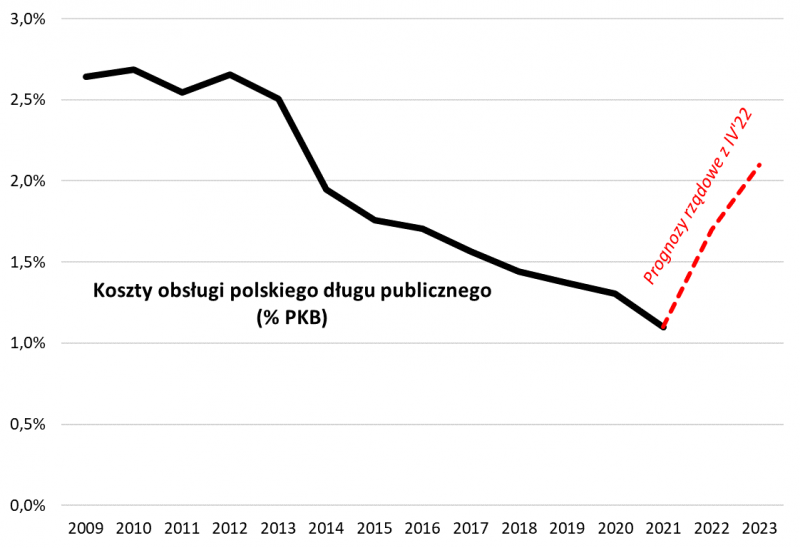 Rys. 4. Dekadowy trend spadkowy kosztów obsługi długu odwraca się na naszych oczach