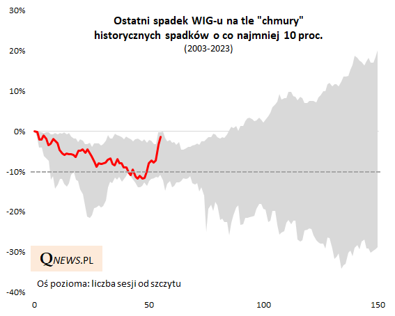 W tym miejscu warto odwołać się do naszych rozważań z końcówki września, w ramach których porównywaliśmy ścieżkę spadkową WIG-u z innymi, co najmniej 10-proc. zniżkami indeksu z ostatnich dwóch dekad. Bazując na tym porównaniu pisaliśmy wtedy, że "należałoby założyć, że na krótką metę WIG nie ma dużego potencjału spadkowego, a może nawet ma przestrzeń do odreagowania w kierunku górnej granicy 'chmury'". Owe potencjalne odreagowanie zmaterializowało się w stopniu przekraczającym nasze nadzieje. Obecnie, po odświeżeniu, wykres z końcówki września wygląda następująco.