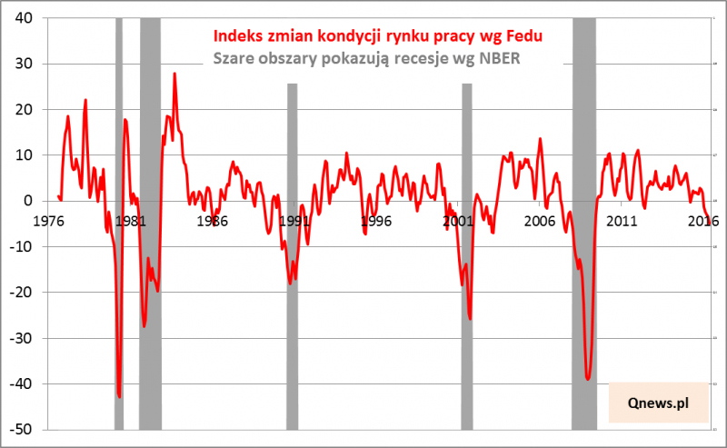 Dziś Brytyjczycy zdecydują w referendum czy chcą wyjść z UE. Z zakładów bukmacherskich wynika, że prawdopodobieństwo "Brexit" jest stosunkowo małe. Oczywiście gdyby wynik okazał się odmienny, nerwowa reakcja rynków byłaby nieunikniona. Podobnie jednak jak to było z "Grexit" przed rokiem, nie należy przeceniać znaczenia tego czynnika w średnim terminie. Dużo bardziej liczyć się będzie bowiem to, jak inwestorzy będą oceniać perspektywy wzrostu gospodarczego na świecie. Jak już wskazywaliśmy przy okazji omawiania różnych wskaźników makro (np. indeksów koniunktury OECD), obecnie gospodarki są w fazie zadyszki. To newralgiczna pozycja w cyklu koniunkturalnym, bo nie wiadomo czy z tego punktu wejdziemy w fazę głębszego spowolnienia (a nawet globalnej recesji), czy skończy się jedynie na chwilowym schłodzeniu. Do kolekcji wskaźników obrazujących ten stan rzeczy dorzucić można kolejny, na który uwagę zwrócili ostatnio analitycy banku J.P. Morgan - "indeks zmian kondycji rynku pracy" (CLMCI) publikowany przez Fed. W maju znalazł się on na poziomie -4,8 pkt., czyli najniżej od siedmiu lat (!).