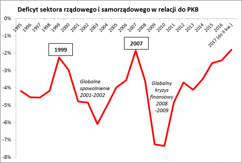 Deficyt polskiego sektora rządowego i samorządowego w porównaniu z PKB jest najmniejszy od dziesięciu lat. Jest jednak pewien problem – w przeszłości, gdy deficyt był tak mały, potem … zaczynał rosnąć na skutek globalnego spowolnienia.