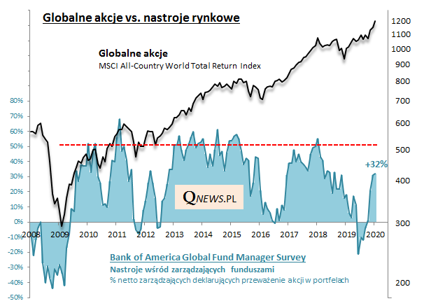 Z jednej strony faktem jest to, że nasza ulubiona miara z sondażu BAML - odsetek netto zarządzających deklarujących przeważenie akcji w portfelach - jest najwyżej od 17. miesięcy (wynosi +32 pkt. proc.). Przypomnijmy, że jeszcze w połowie ub.r. była z kolei najniżej od ... 2009 roku.