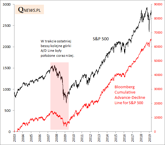 Dwa tygodnie temu pisaliśmy, że tzw. wskaźnik szerokości trendu zwyżkowego na Wall Street zachowuje się raczej jak w trakcie hossy, niż bessy. I ten stan rzeczy ciągle obowiązuje. Wskaźnik Advance/Decline Line wręcz bije nowe rekordy. Dla porównania, w okresie ostatniej bessy (2007-2009) systematycznie opadał.