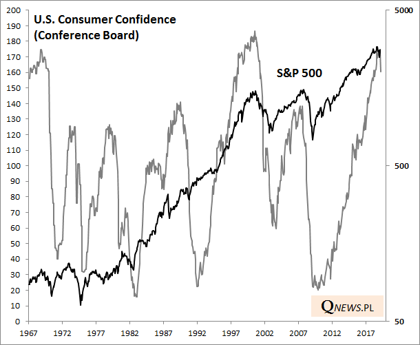 Jak widać szczyty wskaźnika nastrojów konsumentów, szczególnie te na tak wysokich pułapach, historycznie pokrywały się ze szczytami hossy na Wall Street. Choć oczywiście nie ma żadnej gwarancji, że to już jest ten właściwy szczyt. W poprzednich cyklach wskaźnik nastrojów konsumentów stawał się najpierw dość rozchwiany (1998-2000, 2006-2007), zanim ostatecznie wpadł w ten właściwy trend spadkowy.