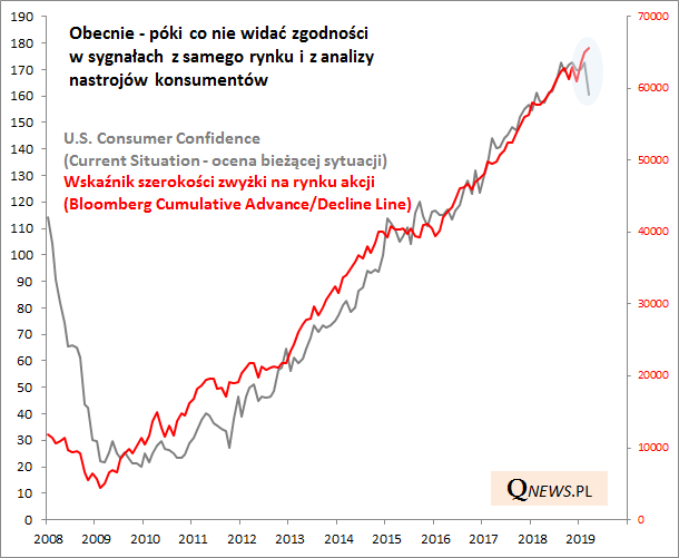 Nasza teza - do przekształcenia się hossy w bessę potrzeba chyba czegoś więcej niż jednomiesięczny spadek wskaźnika zaufania konsumentów. Będziemy obserwować sytuację pod kątem tego czy to nastroje konsumentów zaczynają się poprawiać w ślad za mocnym rynkiem akcji, czy raczej oba omówione wskaźniki podążą solidarnie w dół tak jak to było w trakcie ostatniej bessy.