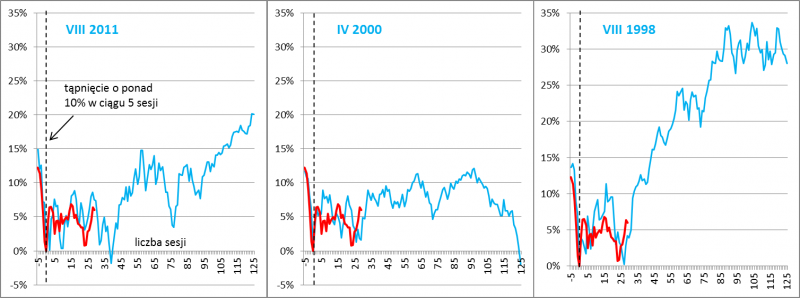 Na krótką metę nie jest jasne czy S&P 500 ostatecznie "pożegnał się" już z dołkiem paniki i teraz czas na trwalszą poprawę (tak jak np. w roku 1998), czy jeszcze dołek musi zostać ponownie przetestowany (rok 2011). Niemniej w średnim terminie rozumianym jako ok. 100 sesji (niecałe 5 miesięcy) od dołka wszystkie trzy przypadki kończyły się "happy-endem". Jeśli historia się powtórzy, to końcówka roku zgodnie z tradycją powinna być zatem w miarę udana dla inwestorów. Pytanie co później? W dwóch z trzech wymienionych przypadków następował powrót do hossy, natomiast w jednym (rok 2000) średnioterminowa poprawa właśnie po ok. 100 sesjach dobiegła końca i wystartowała kolejna fala bessy. Innymi słowy, mniej więcej do połowy stycznia 2016 roku byki na Wall Street będą potencjalnie miały czas na rozgrywanie pozytywnego scenariusza. Przez ten czas być może pojawią się nowe wskazówki co do tego czy sierpniowe tąpnięcie było tylko chwilowym wypadkiem przy pracy, czy też początkiem trwalszej zmiany trendu.