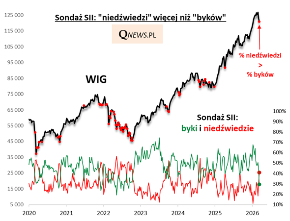 Wystrzał odsetka pesymistów, przy jednoczesnym tąpnięciu odsetka optymistów, sprawił, że "niedźwiedzie" zyskały przewagę liczebną w sondażu. Z takim wydarzeniem mamy do czynienia również po raz pierwszy od kwietnia 2025.