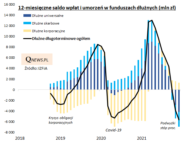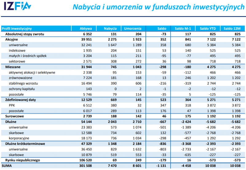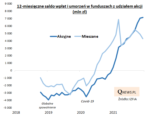 Najnowsze dane Izby Zarządzających Funduszami i Aktywami pokazują, że grudzień przypieczętował cały 2021 rok, jeśli chodzi o kierunek przepływów kapitałów na polskim rynku funduszy inwestycyjnych. W ostatnim miesiącu roku pieniądze nadal napływały do funduszy akcyjnych (+352 mln zł netto), a jednocześnie ciągle odpływały z funduszy dłużnych (-667 mln zł netto z funduszy dłużnych długoterminowych oraz -836 mln zł netto z dłużnych krótkoterminowych).