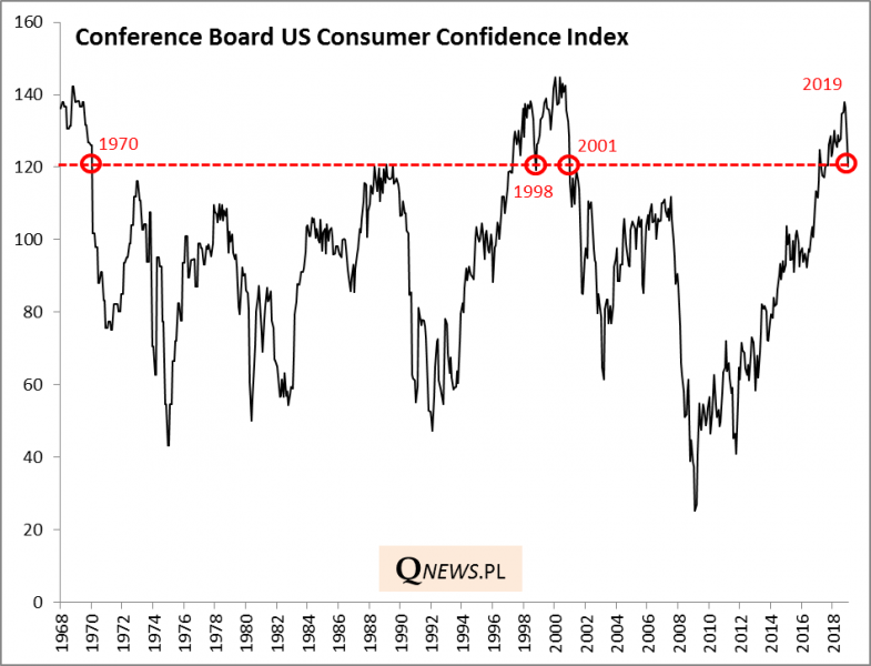 Rzut oka na wykres głównego wskaźnika Conference Board (nie będziemy się tu rozpisywać na temat subindeksów oczekiwań i ocen bieżącej sytuacji) przypomina, że główne niebezpieczeństwo polega na tym, że nastroje pogarszają się szybko z bardzo wysokich pułapów (pisaliśmy o nich w ub.r.), a przestrzeń do dalszego potencjalnego pogorszenia jest ciągle znaczna. To jeden z dowodów na to, co Amerykanie nazywają "late cycle" (mocno zaawansowana faza ekspansji gospodarczej).