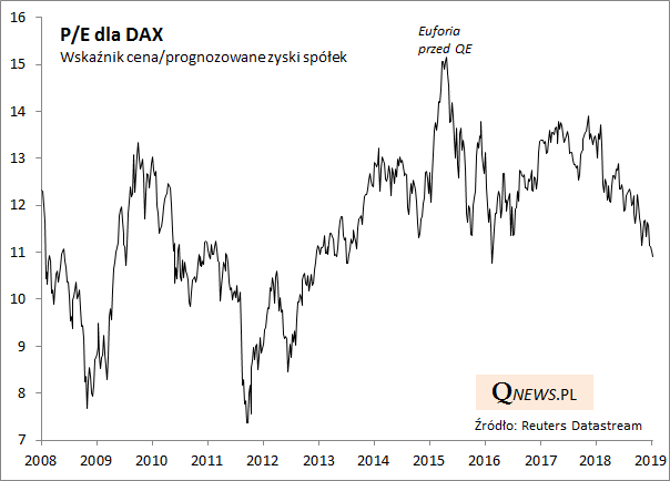 Do przeciętnego poziomu zeszły też wskaźniki P/E w Europie Zachodniej. Przykładowo P/E dla niemieckiego DAX-a znalazł się w okolicy 11x, mniej więcej tam gdzie ustanowił twarde dno na początku 2016 roku. Ale i jemu ciągle daleko do "kryzysowych" pułapów (7-8).