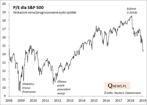 Na Wall Street wskaźnik wyraźnie spadł. Podczas gdy w trakcie euforii sprzed roku ("globalne zsynchronizowane ożywienie", moda na FAANG, ekscytacja cięciami podatkowymi Trumpa) P/E zbliżało się do 19x, to w trakcie wyprzedaży spadło do nieco ponad 14x. To znaczący postęp. Wyceny akcji na Wall Street przestały być rażąco wysokie - stały się o wiele bardziej rozsądne. Ale czy jest tanio? Pod tym względem sprawa nie jest taka oczywista, bo w okresach kryzysowych (2008/2009, 2011) amerykańskie akcje kupić można było za 10-11-krotność zysków. Oczywiście nie ma żadnej pewności, że wyceny muszą obecnie zejść tak nisko.