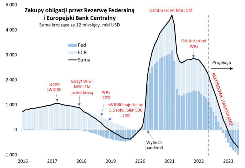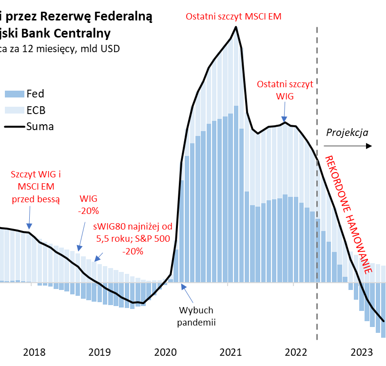 Rys. 2. Redukcja bilansu Fedu i mniejsze zakupy ECB to bezprecedensowe ograniczanie strumienia globalnej płynności