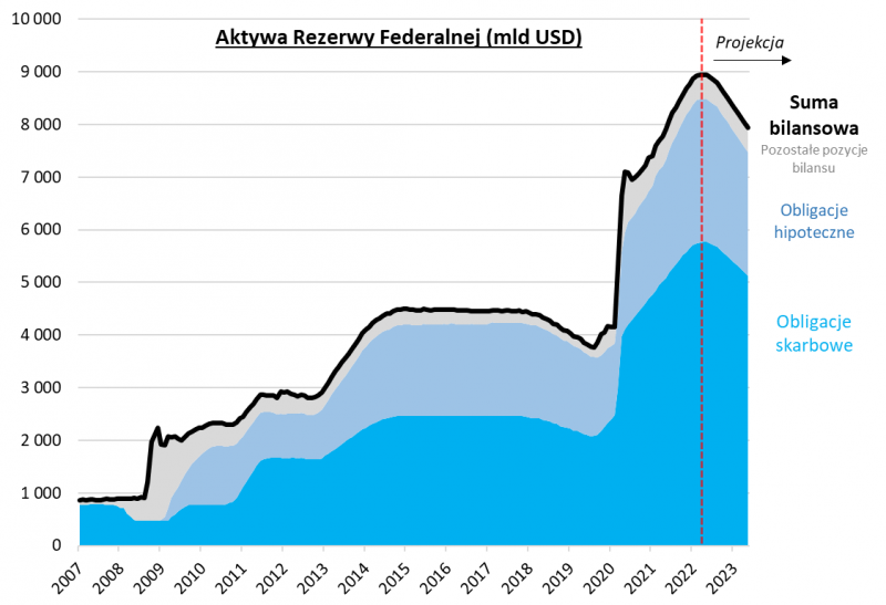 Bilans Fedu, który na skutek pandemicznego QE spuchł do prawie 9 bilionów dolarów, osiągnął już szczyt swej wielkości, a teraz czeka go systematyczne odchudzanie. Szacujemy orientacyjnie, że do końca roku zostanie zredukowany łącznie o ponad pół biliona USD, a w ciągu 12 miesięcy od końca kwietnia br. o 900 mld USD. Szybkość redukcji ma być wyraźnie większa niż w trakcie poprzedniego epizodu „normalizacji” bilansu z lat 2017-19.