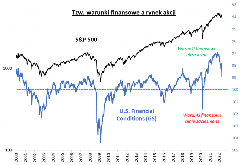 Ale wobec tego może jest tak, że giełdy już zdyskontowały w całości trwające ograniczanie globalnej płynności? Aby to ocenić, możemy odwołać się choćby do wskaźnika tzw. warunków finansowych (ang. financial conditions). Już w marcu FOMC wykreślił ze swego komunikatu po posiedzeniu stwierdzenie na temat utrzymywania „sprzyjających warunków finansowych”, więc jasne stało się, że będzie dążył do ich zacieśnienia w celu walki z inflacją. Tymczasem na warunki finansowe, według np. konstrukcji popularnego wskaźnika Goldman Sachs, składają się m.in. wyceny akcji na Wall Street.