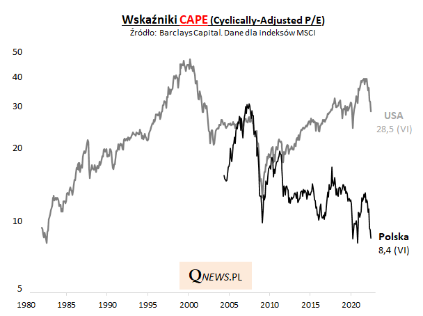 Według wskaźnika CAPE, czyli tzw. skorygowanego cyklicznie P/E (cena/zysk), polskie akcje wydają się, przynajmniej na pierwszy rzut oka, "tanie jak barszcz". W czerwcu CAPE zszedł do zaledwie 8,4 i jest już o przysłowiowy kroczek od historycznego minimum odnotowanego w trakcie covidowego krachu (8,06) - pokazują najnowsze wyliczenia Barclays Capital przy współpracy z noblistą, prof. Robertem Shillerem, twórcą koncepcji CAPE. Jest to o tyle ciekawe, że wskaźnik ten w odniesieniu np. do amerykańskich akcji, co prawda również w I półroczu spadał, ale jest ciągle raczej bliżej szczytów niż dołków i trudno byłoby w tym przypadku mówić o wyjątkowej okazji.