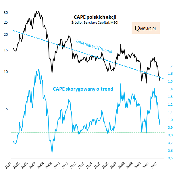 Reasumując, wyceny polskich akcji mierzone CAPE są na ultra niskim poziomie, bliskim historycznemu minimum. Zachowanie CAPE na przestrzeni lat pozostawia jednak spory niedosyt, bo każdy kolejny dołek położony jest na coraz niższym pułapie.