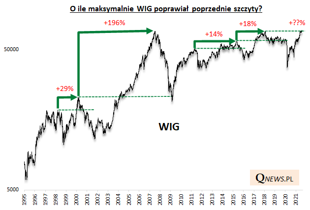 Dobra wiadomość jest taka, że bez względu na to, który przypadek wydaje się obecnie bardziej prawdopodobny, to i tak widać ciągle spory potencjał wzrostowy dla rodzimego rynku akcji, bo na razie WIG jest niespełna 2% powyżej poprzedniej górki. Nawet w oparciu o najmniej optymistyczny przypadek z historii (lata 2011-15), który przyniósł zwyżkę o 14%, można założyć, że indeks powinien dotrzeć przynajmniej w okolicę 77.000 pkt. zanim fala hossy ulegnie definitywnemu załamaniu (ale niekoniecznie musi się to odbyć w ekspresowym tempie).