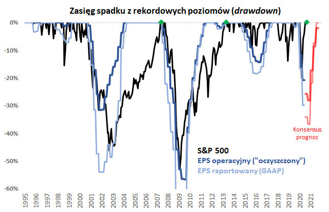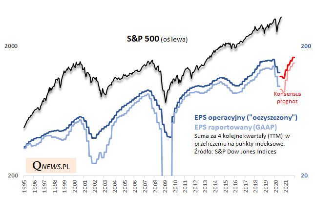 - Oznacza to, że w odróżnieniu od poprzednich historycznych epizodów (2007-09, 2000-01) nowy rekord S&P 500 wyprzedził (i to znacząco) rekord EPS;