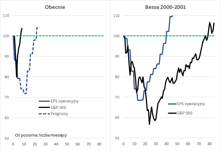Jest jeszcze druga kwestia. Obecne zachowanie S&P 500 zupełnie nie przypomina tego z omawianego przypadku lat 2000-01, mimo dość zbliżonego jak na razie zachowania EPS. Zauważmy, że wtedy indeks spadał jeszcze nawet w początkowej fazie odbudowy zysków firm. A całe straty odrobił po ponad … sześciu latach (!), licząc od początku bessy. W tym kontekście sięgnięcie przez S&P 500 po nowy rekord zaledwie pół roku po ustanowieniu szczytu sprzed gwałtownego załamania EPS jest czymś wręcz szokującym na tle historycznych przypadków.