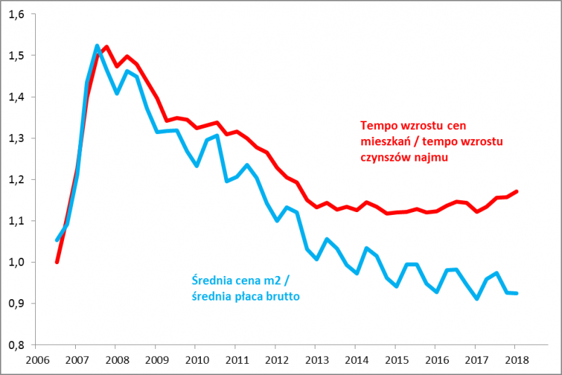 Dobra wiadomość jest natomiast taka, że choć nominalne ceny nieruchomości atakują rekordy sprzed dekady, to w porównaniu np. z dochodami czy też zasobnością Polaków wcale nie są tak wysokie. Porównaliśmy przykładowo średnią cenę metra kwadratowego ze średnim wynagrodzeniem brutto. Okazuje się, że ten współczynnik, którego gwałtowny wystrzał dziesięć lat temu był najbardziej namacalnym symptomem bańki, obecnie … szoruje po dnie. Pod tym względem nie widzimy jeszcze niepokojących sygnałów.