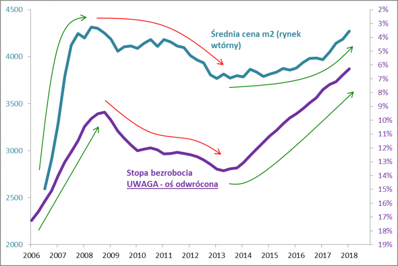 Ceny mieszkań rosną stopniowo od około pięciu lat (dołek odnotowaliśmy na przestrzeni 2013 roku). To nie przypadek, jeśli weźmiemy pod uwagę, że mniej więcej od tego samego czasu spada stopa bezrobocia rejestrowanego w naszym kraju. Wcześniej trwający od jesieni 2008 (globalny kryzys finansowy) wzrost bezrobocia był z kolei skorelowany ze spadkiem cen mieszkań. Wniosek? Hossa w nieruchomościach zakończy się, gdy długoterminowa faza ekspansji w gospodarce polskiej (europejskiej) dobiegnie końca.