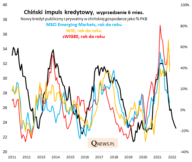 Jeśli teza o spowolnieniu jest trafna, to powinna przekładać się na obniżanie się rocznej dynamiki indeksów giełdowych. Jak na razie najpilniej w ślad za impulsem podąża dynamika benchmarku rynków wschodzących, co nie dziwi o tyle, że to właśnie Chiny są największym emerging markets. Jeśli wierzyć poniższemu wykresowi, na wiosnę 2022 12-miesięczna zmiana indeksu MSCI EM powinna teoretycznie być już na sporym minusie.