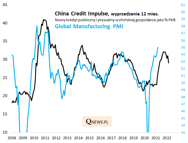 Uwagę na powyższym wykresie zwraca z pewnością niezwykle regularny cykl powtarzający się od lat. Ale czy ten cykl ma konkretne przełożenie na globalne wskaźniki? Na kolejnym wykresie pokazujemy, że być może chiński impuls kredytowy ze sporym wyprzedzeniem (nawet 12-miesięcznym) pozwala prognozować co będzie się mniej więcej działo z globalnym wskaźnikiem PMI dla przemysłu.