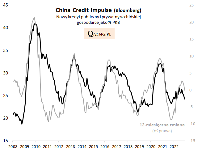 Z tego względu najnowszy szacunek chińskiego impulsu za grudzień 2022 wymaga bacznej uwagi. Niestety najnowsze dane Bloomberga pokazują, że dobrze zapowiadająca się wcześniej poprawa impulsu zaczyna dla odmiany ... coraz bardziej słabnąć. Zamiast tak jak to zwykle bywało kontynuować zwyżkę ku cyklicznym górkom, impuls zaczął coraz mocniej zakręcać w dół (24,3% PKB w grudniu - najniżej od 10 miesięcy). Zwrot odnotowujemy również w przypadku 12-miesięcznej dynamiki impulsu, która znów znalazła się w okolicach zera. Widać, że "wspomaganie" wzrostu chińskiej gospodarki nie chce działać tak jak wcześniej - czyżby był to wynik pogłębiających się strukturalnych problemów Chin (np. związanych z rynkiem nieruchomości)?