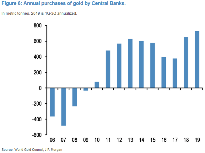 Analitycy J.P. Morgan (JPM) wzięli pod lupę dane z rynku złota. Po pierwsze przypominają, że jedną z dwóch sił popytowych są obecnie banki centralne - ich zakupy okazały się w ub.r. największe od co najmniej kilkunastu lat. Na przestrzeni ub.r. pisaliśmy kilkakrotnie o tym, że najwięcej złota gromadzą banki centralne Chin oraz Rosji w związku z napięciami geopolitycznymi.