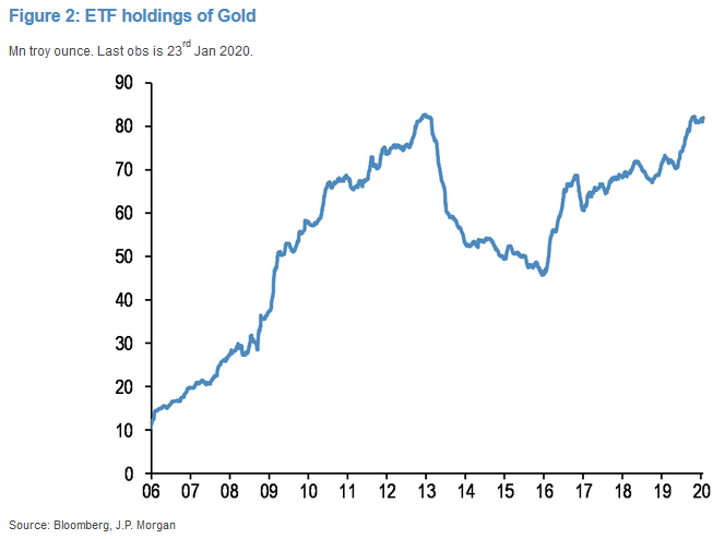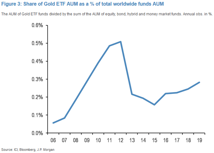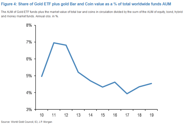 Po pierwsze szacowana zagregowana alokacja inwestorów indywidualnych w złoto jest nadal niska z historycznego punktu widzenia. Wartość środków zgromadzonych w funduszach ETF inwestujących w szlachetny metal mimo niemal rekordowych poziomów i tak jest ciągle sporo niższa od rekordu w ujęciu relatywnym, czyli w porównaniu ze środkami zgromadzonymi we wszystkich innych funduszach, czyli np. akcji, obligacji czy też pieniężnych.
