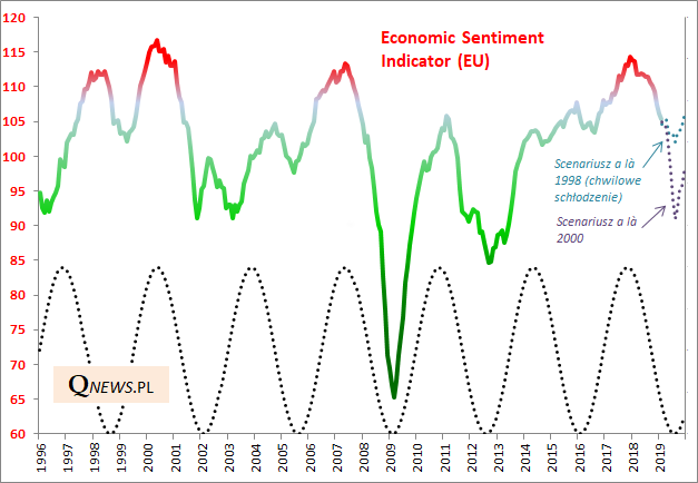 Na tym etapie wciąż nie ma żadnej pewności czy zadyszka w gospodarkach okaże się chwilową słabością (jak np. w 1998 roku) czy też wstępem do recesji. ESI, podobnie jak inne tego typu wskaźniki makroekonomiczne, porusza się w wyraźnym cyklu, ale nie jest jasne czy dno tego cyklu zostało już osiągnięte.