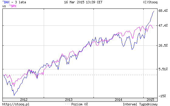 Czy ktoś pamięta jeszcze, że nie tak dawno - na jesieni 2014 r. - sytuacja wyglądała zupełnie inaczej? Niemiecki indeks osunął się wówczas do poziomu najniższego od roku, przede wszystkim za sprawą obaw przed kolejną falą spowolnienia gospodarczego w strefie euro. Od ustanowionego wtedy dołka DAX podrósł do tej pory o ponad 1/3, m.in. właśnie dlatego, że koniunktura gospodarcza (szczególnie w Niemczech) okazuje się lepsza niż się obawiano. Do tego dochodzi rzecz jasna QE w strefie euro.
