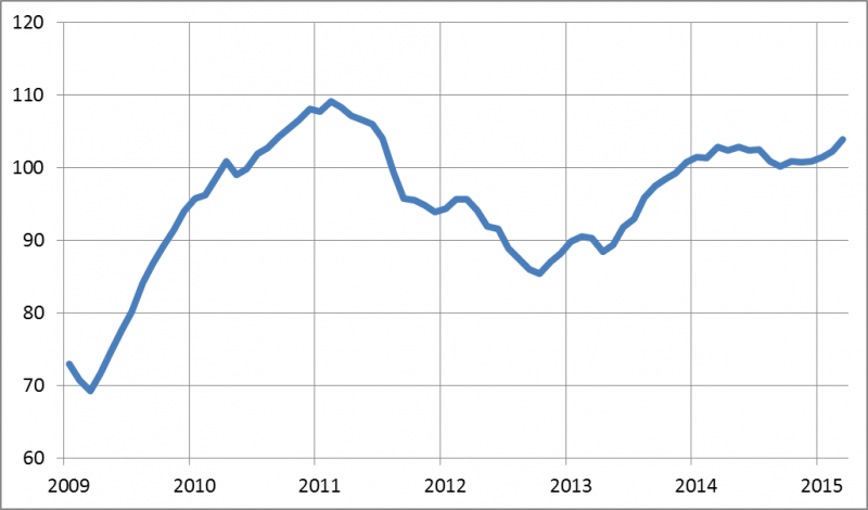 Trudne negocjacje Grecji z wierzycielami to tylko fragment prawdy na temat kondycji strefy euro. Na szczęście są też dobre wieści. Lista wskaźników pokazujących poprawę koniunktury gospodarczej w eurolandzie wydłużyła się dziś o indeks nastrojów w biznesie (Economic Sentiment Indicator). Jak pokazuje wykres, obrazujący aktywność w rozmaitych sektorach wskaźnik pokonał szczyty z pierwszej połowy ubiegłego roku i znalazł się najwyżej od prawie czterech lat. Wygląda zatem na to, że zadyszka w europejskiej (jak i w polskiej) gospodarce była jedynie przejściową usterką w cyklu wzrostowym.