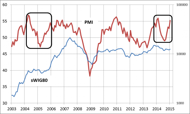 Jak to interpretować? Kiedy przed rokiem PMI osiągnął tak wysokie wartości, był to dla nas raczej powód do obaw przed zadyszką, co zresztą okazało się słuszne, bo później przez większość 2014 r. wskaźnik opadał (w czym bardzo "pomógł" konflikt rosyjsko-ukraiński). Teraz jednak wydaje się, że taki mechaniczny sposób interpretacji byłby niewłaściwy. Po pierwsze dlatego, że (w odróżnieniu np. do roku 2013) nie mamy za sobą silnego ożywienia na GPW, które by świadczyło o tym, że poprawa koniunktury gospodarczej została dawno zdyskontowana w cenach akcji - przykładowo wrażliwe na koniunkturę akcje małych spółek dopiero zaczynają się podnosić.