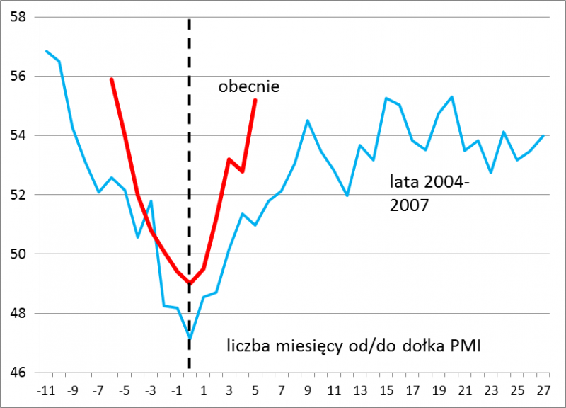 Drugi powód do analogie historyczne. Naszym zdaniem najpierw spadek, a potem ostatnie silne odbicie PMI bardzo przypomina to, co działo się w latach 2004-2005. Ten przypadek historyczny jest najbardziej podobny pod względem tempa i zasięgu zmian.