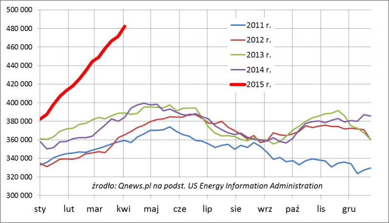 Od trzech miesięcy notowania surowca konsolidują się w pobliżu dołków, czemu towarzyszy napływ danych świadczących o tym, że póki co ubiegłoroczny szokowy spadek cen nie wywołał załamania się podaży. Wręcz przeciwnie, trendy podążają w dotychczasowym kierunku. Dobrym przykładem są cotygodniowe dane nt. wielkości zapasów surowca w USA. Od początku roku zapasy rosną jak na drożdżach - ten trend zdecydowanie odbiega od normy z poprzednich lat. To konsekwencja faktu, że mimo dużo niższych cen, wydobycie ropy w USA nie tylko nie maleje, ale nadal rośnie.