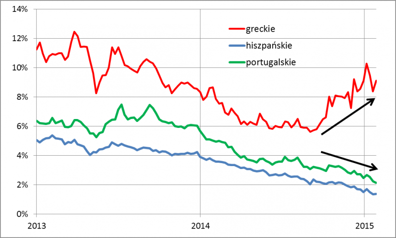 Zapowiedź QE w strefie euro wywołała dalsze zawężenie się różnicy (spreadu) między rentownością obligacji zadłużonych krajów peryferyjnych strefy euro, a rentownością uznawanych za bezpieczną przystań papierów niemieckich ("Bundów"). Z jednym wyjątkiem - Grecji. Tam zwycięstwo wyborcze sprzeciwiającej się oszczędnościom budżetowym partii Syriza i nieoczekiwana koalicja z radykalnym ugrupowaniem Niepodlegli Grecy stawia pod znakiem zapytania przestrzeganie porozumień z Unią Europejską i MFW.