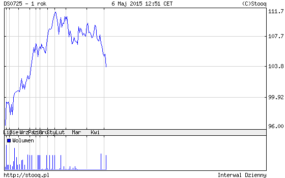 Przykładowo zobaczmy co w ostatnim czasie stało się z kursem wygasającej w lipcu 2025 roku obligacji DS0725. Jeszcze na początku roku notowana była po 111% wartości nominalnej (czyli 1110 zł), a teraz jej kurs nie przekracza 104%. To strata rzędu 6% w ciągu kilku miesięcy - to pokazuje, że obligacje to nie jest inwestycja pozbawiona ryzyka. Kurs musiał spaść, by rentowność papieru dostosowała się do wyższego poziomu żądanego przez inwestorów.