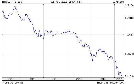 Turecka lira znów bije rekordy słabości względem dolara amerykańskiego (względem euro jest ostatnio w miarę stabilna) w ramach długoterminowego trendu. Jeszcze niedawno słabości TRY względem USD była przede wszystkim ogólna siła amerykańskiego pieniądza względem innych walut (ze względu na ożywienie w USA i perspektywy podwyżek stóp procentowych). Ostatnio doszło do tego ryzyko polityczne. Coraz bliżej jest bowiem do zaplanowanych na 7 czerwca wyborów parlamentarnych w Turcji. Podczas gdy stojący na czele partii AKP Tayyip Erdogan dąży do znacznego wzmocnienia roli prezydenta w systemie politycznym, to nie jest wcale pewne czy AKP zdoła zachować większość głosów, bo do gry mocno włączyła się partia tureckich Kurdów (HDP). Historycznie stosunki mniejszości kurdyjskiej z władzami w Stambule bywały napięte.