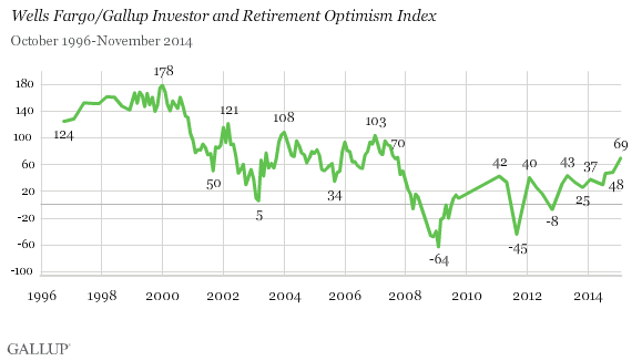 Wyniki kwartalnej ankiety Wells Fargo/Gallup wśród ponad 1000 Amerykanów posiadających aktywa finansowe o wartości minimum 10 tys. USD pokazują, że optymizm wśród inwestorów stopniowo rośnie. Według najnowszego odczytu indeks optymizmu znalazł się na poziomie najwyższym od 2007 roku.