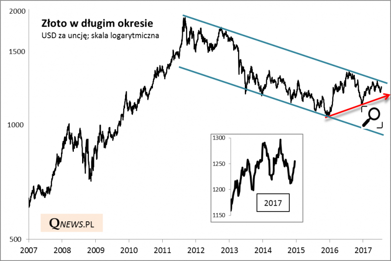 Ów "zygzak" na nowo przybliża notowania złota do górnej linii kanału spadkowego, obejmującego aż sześć lat! Cały czas zwracamy też uwagę, że w tym samym okresie rynki akcji - głównie te rozwinięte, z USA na czele - przeżyły silną falę hossy. W którymś momencie korzyści z dywersyfikacji portfela wynikające z obecności w nim złota powinny o sobie przypomnieć.