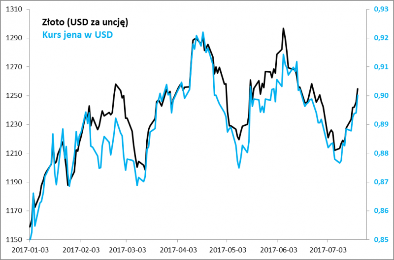 Cały czas monitorujemy wielkość pozycji spekulacyjnych - ich analiza okazuje się tu trafniejsza, niż wszelkie rozważania dotyczące fundamentów. Dobra wiadomość jest taka, że mimo kolejnego "zygzaka" w górę, na razie duzi spekulanci (fundusze hedgingowe) ciągle dość niechętnie patrzą na to aktywo - z najnowszych danych komisji CFTC wynika, że krótkie pozycje nadal są bliskie rekordów. A skoro mowa o zaangażowaniu spekulantów, to jeszcze ważna ciekawostka. Zwracaliśmy już wcześniej uwagę, że cena złota jest silnie skorelowana z kursem jena japońskiego - oba aktywa postrzegane są bowiem tradycyjnie jako "bezpieczna przystań".