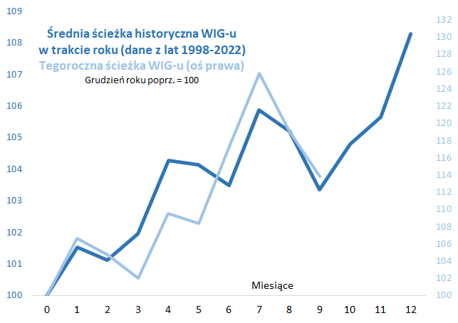 Jeśli popatrzymy na uśrednioną ścieżkę WIG-u w trakcie roku, to swój lokalny dołek osiąga ona wraz z końcem września, by potem w ostatnich trzech miesiącach wspinać się coraz wyżej. Październik przynosi odrobienie większości wrześniowych strat, listopad kontynuuje tę tendencję, zaś – zdecydowanie najlepszy w tym gronie („rajd św. Mikołaja”) – grudzień winduje WIG do nowego szczytu.