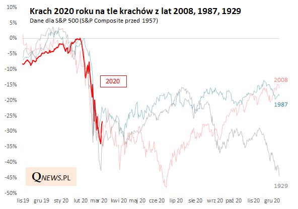 Nie ma wątpliwości, że ścięcie ponad jednej trzeciej wartości S&P 500 w ciągu kilku tygodni to jeden z najgwałtowniejszych krachów w historii. Analiza danych pokazuje, że ostatnie wydarzenia można porównać z takimi epizodami z przeszłości, jak najbardziej dramatyczna fala bessy z 2008 roku (panika po upadku Lehman Brothers), krach z jesieni 1987 oraz - sięgając jeszcze dalej wstecz - krach z jesieni 1929 roku.