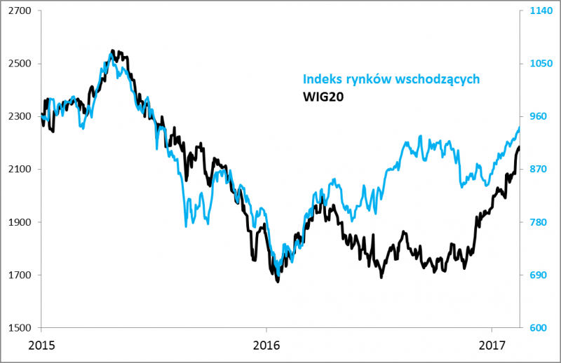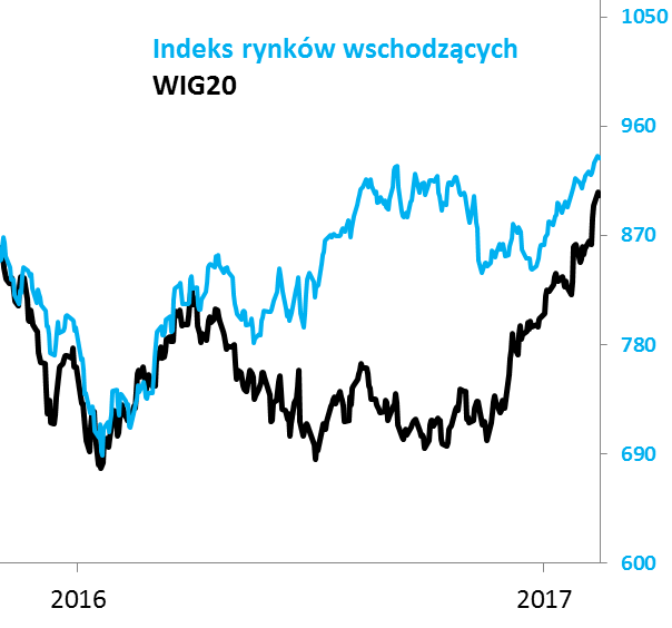Potężny ruch zwyżkowy WIG20 od jesiennych dołków (ponad 25%!) można rozłożyć na dwa elementy: (a) wzrost indeksu rynków wschodzących, z którym rodzimy indeks blue chips jest na dłuższą metę silnie skorelowany (zaledwie +4% od końca IX); (b) nadrabianie zaległości WIG20 względem emerging markets powstałych wcześniej w wyniku zniechęcenia zagranicznych inwestorów krajową polityką. Jak widać ten drugi element miał do tej pory kluczowe znaczenie - kapitał zagraniczny rzucił się do kupowania krajowych akcji/zamykania krótkich pozycji tak, by domknąć tzw. niedoważenie względem innych rynków. Wydaje się, że na obecnym etapie zaległości WIG20 są już niewielkie i z tego źródła trudno już oczekiwać paliwa do zwyżek.