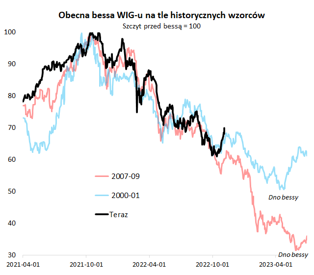Gorsza wiadomość jest taka, że bez względu na który z tych wzorców spojrzymy, żaden z nich nie daje dużo miejsca i czasu na kontynuację obecnego odreagowania. Gdyby wzorce potraktować w sposób bardzo dosłowny (a takie dosłowne podejście sprawdzało się w tym roku wyśmienicie), to należałoby oczekiwać, że po październikowym zrywie WIG resztę IV kwartału powinien spędzić już bardziej na huśtawce nastrojów niż dynamicznym odrabianiu strat. Z kolei początek nowego roku powinien wg tych analogii przynieść przysłowiowy „defekt stycznia” w postaci wznowienia bessy i pogłębienia jej dołków. Twardego dna trendu spadkowego należałoby się spodziewać gdzieś na przestrzeni II kwartału 2023.