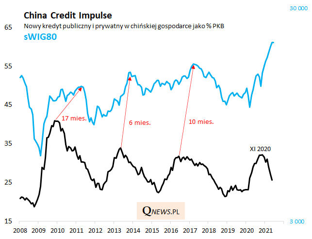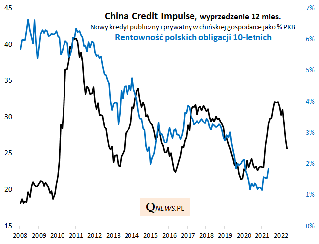 Nie ma chyba większych wątpliwości co do tego, że od kiedy chińska gospodarka stała się jedną z największych na świecie, ze znaczącą rolą eksportu i importu, trendy panujące w niej promieniują na cały świat. Z tego względu kolejny spadek tzw. chińskiego impulsu kredytowego w maju (do 25,6%) podtrzymuje naszą wcześniejszą tezę o tym, że na horyzoncie widać perspektywę coraz głębszego spowolnienia w globalnej gospodarce. Ze względu na wyprzedzenie widoczne na wykresie spowolnienie to może przypaść na I połowę 2022 roku.