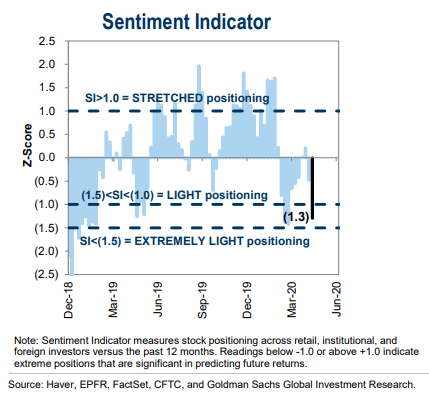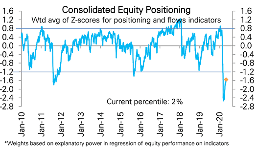 Z drugiej strony można na podstawie przeglądu komentarzy i wypowiedzi strategów odnieść wrażenie, że wiara w rychłe nadejście mocnych spadków jest dość powszechna. To nasze subiektywne odczucie, ale jest też bardziej obiektywny aspekt. Śledzone przez nas wskaźniki nastrojów nie potwierdzają niebezpiecznej euforii. Nawet w tym samym raporcie GS znalazł się wykres sugerujący, że tzw. pozycjonowanie wśród ogółu inwestorów jest ciągle na niskim poziomie - czyżby dominował strach przed nową falą wyprzedaży?