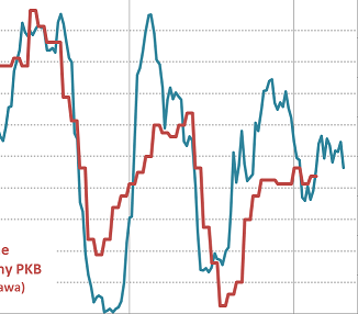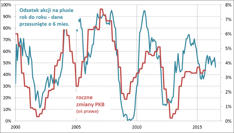 Jak wielokrotnie zwracaliśmy uwagę w naszych historycznych analizach, polski rynek akcji miał w przeszłości wyraźne zdolności prognostyczne względem gospodarki (w myśl zasady, że giełda wyprzedza gospodarkę), tyle tylko, że należało mieć odpowiednie narzędzia, by te zdolności odpowiednio wychwycić. Naszym autorskim sposobem na to jest specyficzny wskaźnik pokazujący jaki odsetek spółek na GPW jest notowany wyżej niż rok (12 miesięcy) wcześniej. Historycznie zmiany trendu tego wskaźnika z ok. półrocznym wyprzedzeniem sygnalizowały podobne zmiany tendencji, jeśli chodzi o dynamikę PKB, przy czym w ostatnich dwóch latach ta zdolność prognostyczna nieco osłabła (np. w 2014 r. mimo negatywnego sygnału nie było głębszego spowolnienia – jedynie zahamowanie szybkiej ekspansji).