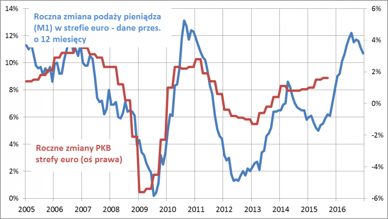 Rys. 2. Podaż pieniądza w strefie euro o rok wyprzedza zmiany PKB